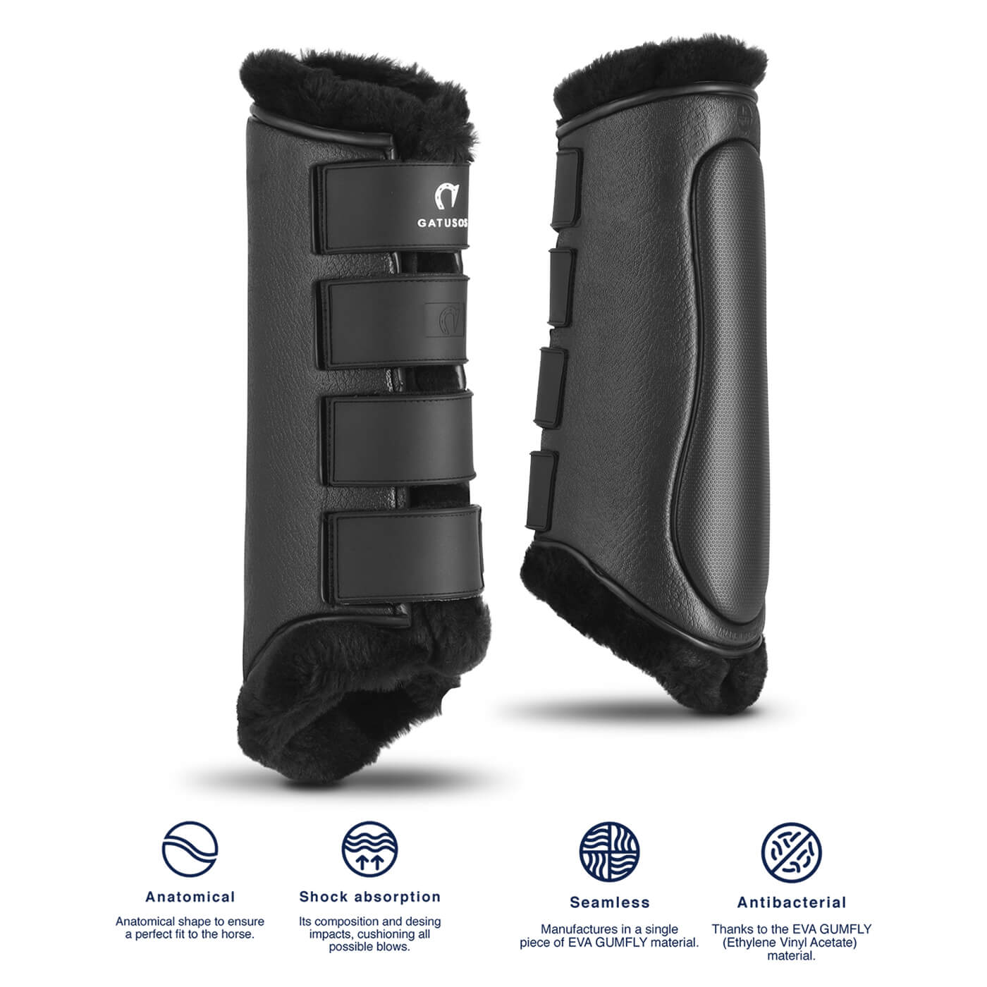 Υψηλού επιπέδου μπότες προστασίας, κατασκευασμένες από υψηλής τεχνολογίας EVA GUMFLY, πατενταρισμένο υλικό ελαστομερούς τύπου μεγάλης ευκαμψίας. Μέγιστη αντοχή σε ακραίες θερμοκρασίες & υψηλή ανθεκτικότητα σε χτυπήματα & έντονη χρήση. Εξαιρετικά μικρό βάρος & ανατομικός σχεδιασμός. Διαπνέον υλικό, αντιβακτηριακή προστασία. Δεν συγκρατεί ιδρώτα. Προστατεύει από χτυπήματα & απορροφά μεγάλα ποσοστά έντασης. Ενιαίο κέλυφος βοηθά στην άμεση εφαρμογή, ενισχυμένα velcro αυξομειώνουν το μέγεθος και εφαρμόζουν σταθερά στο πόδι. Επένδυση συνθετικής αντιβακτηριακής γούνας, χαρίζει έξτρα προστασία σε άλογα με ευαίσθητο δέρμα & τρίχωμα. Εύκολο καθάρισμα & γρήγορο στέγνωμα. Κατασκευάζεται στην Ισπανία.