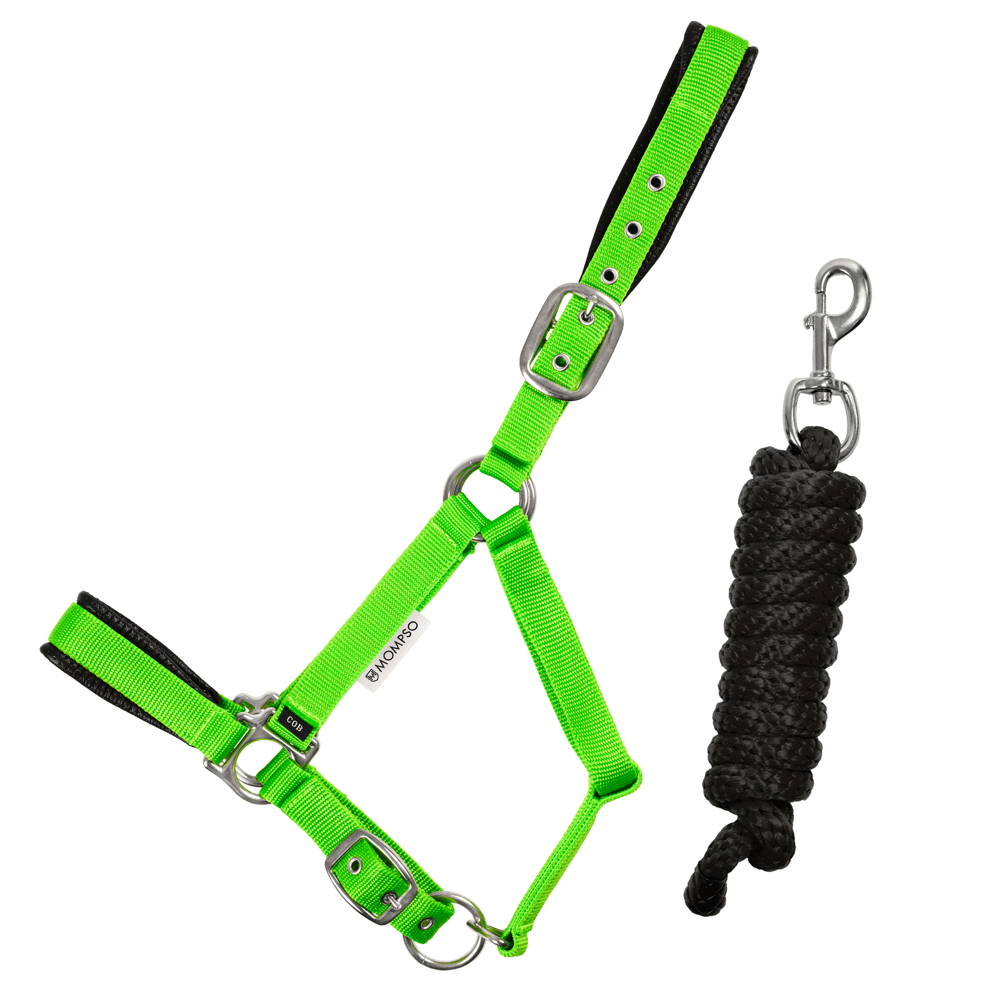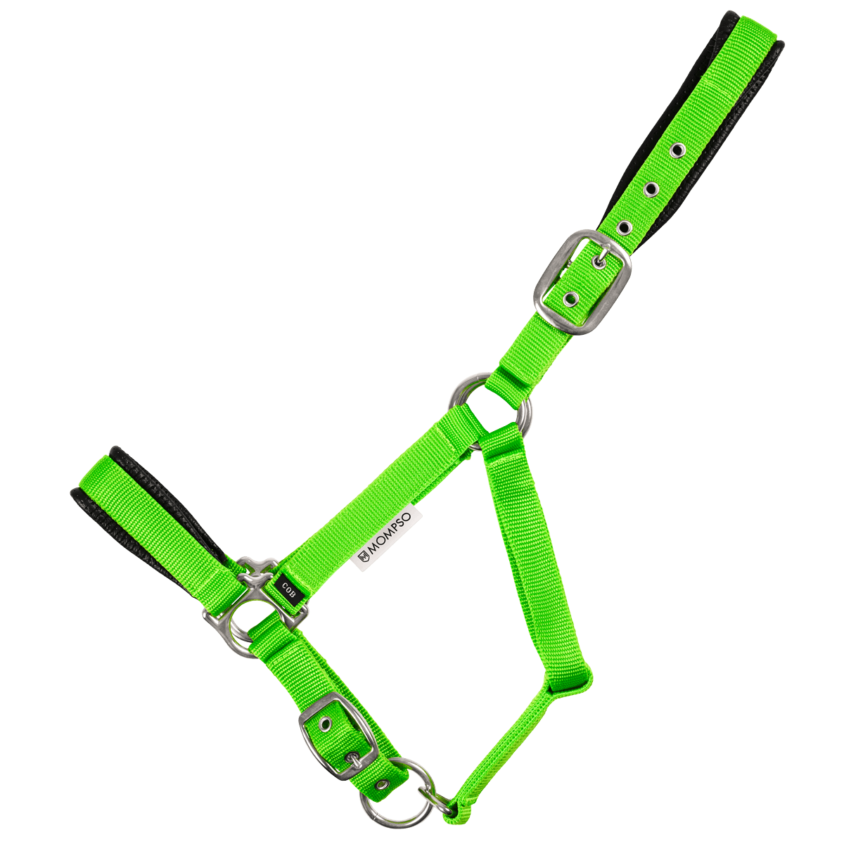 Καπίστρι κατασκευασμένο από ανθεκτικό νάιλον ιμάντα, διπλής επίστρωσης. Προστατευτικές επενδύσεις από μαλακό αφρώδες matt βινύλιο. Ενισχυμένα nickel μεταλλικά στοιχεία. Σημεία πολλαπλής αυξομείωσης. Κινητός κρίκος για εφαρμογή με οδηγό. Λογότυπο MOMPSO SPORT.