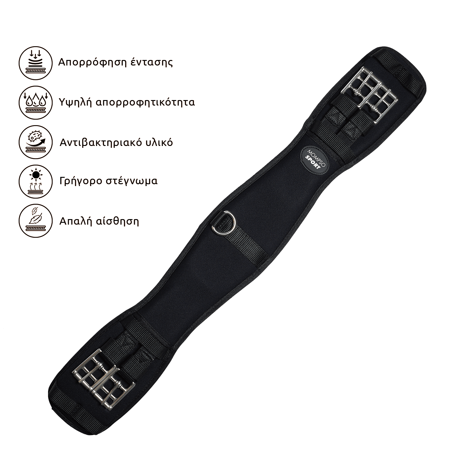 Ανατομικός σχεδιασμός, comfort cut, με απαλή υποαλλεργική σύνθεση υλικού, προστατεύει δέρμα και τρίχωμα. Με αντιβακτηριακή ιδιότητα και Quick Dry σύνθεση. Εσωτερική ενίσχυση memory foam προσφέρει απόσβεση πίεσης και εφαρμόζει με second skin εφαρμογή στο δέρμα. Ανοξείδωτες μεταλλικές αγκράφες και ελαστικοί ιμάντες στις δύο πλευρές. Κεντρικό D-ring για διασύνδεση με martingale και επιστήθιο. Συνδυάζεται με σέλες γενικής χρήσης, εμποδίων, dressage, endurance, trekking. PVC λογότυπο MOMPSO SPORT. Εύκολο καθάρισμα και πλύσιμο στο χέρι στους 30οC.