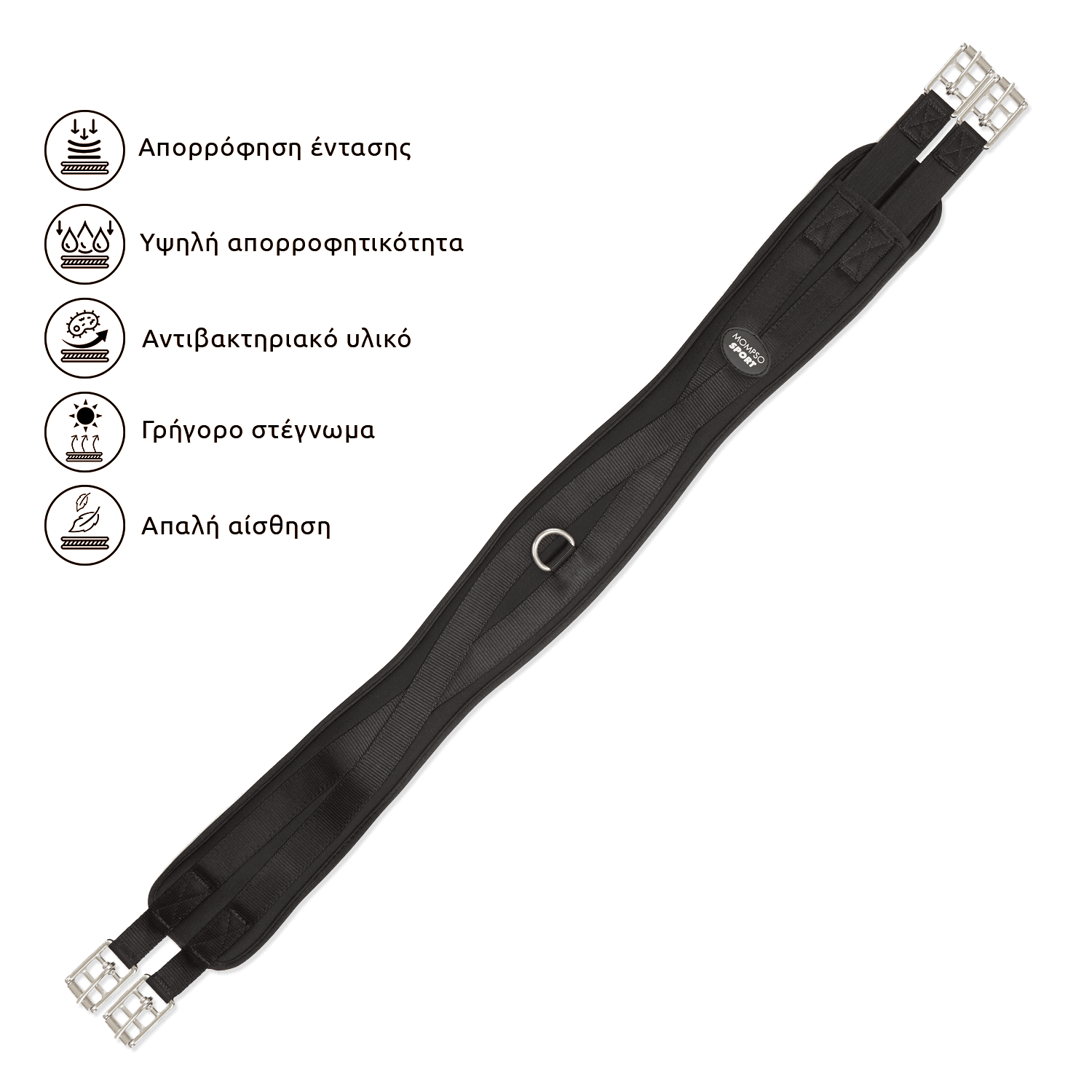 Ανατομικός σχεδιασμός, comfort cut, με απαλή υποαλλεργική σύνθεση υλικού, προστατεύει δέρμα και τρίχωμα. Με αντιβακτηριακή ιδιότητα και Quick Dry σύνθεση. Εσωτερική ενίσχυση memory foam προσφέρει απόσβεση πίεσης και εφαρμόζει με second skin εφαρμογή στο δέρμα. Ανοξείδωτες μεταλλικές αγκράφες και ελαστικοί ιμάντες στις δύο πλευρές. Κεντρικό D-ring για διασύνδεση με martingale και επιστήθιο. Συνδυάζεται με σέλες γενικής χρήσης, εμποδίων, trekking. PVC λογότυπο MOMPSO SPORT. Εύκολο καθάρισμα και πλύσιμο στο χέρι στους 30οC.