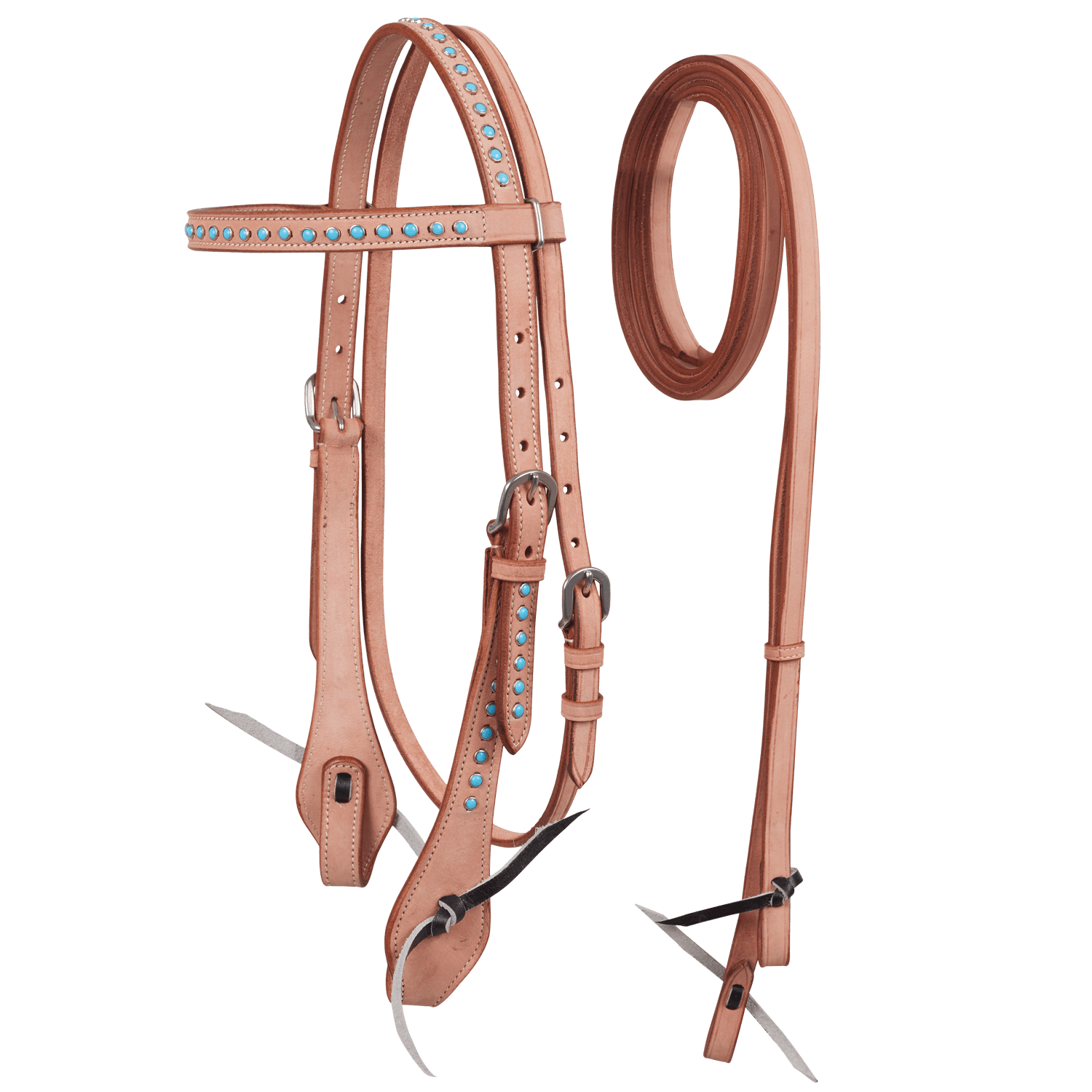 Κατασκευασμένο από ανθεκτικό φυσικό δέρμα. Προμετωπίδα με διάκοσμο από πέτρες σε χρώμα turquoise. Περιλαμβάνονται δερμάτινα ηνία. Ενώσεις latigo/Αυξομείωση με inox αγκράφα ασφαλείας. Ιδανικό χαλινό για ελεύθερη ιππασία, συνδυάζεται με σέλες western & trekking.