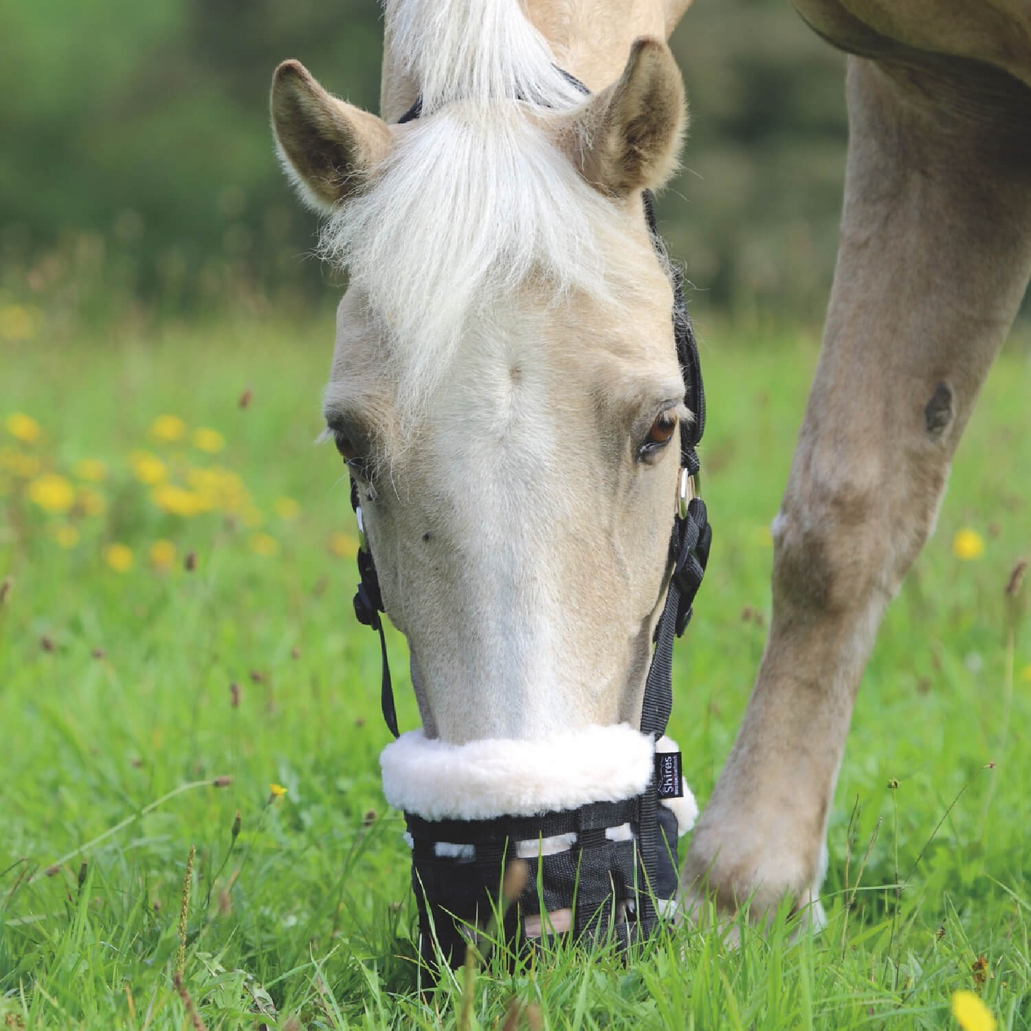 Kατασκευασμένο από ανθεκτικό ιμάντα με περιμετρικές διόδους για άμεσο αερισμό. Το κεντρικό λαστιχένιο τμήμα με την οπή ελέγχει την ποσότητα γρασιδιού που εισέρχεται στο στόμα. Ειδικά προστατευτικά τμήματα στην μύτη κατά των ερεθισμών. Αυξομειούμενοι ιμάντες για την ενσωμάτωση στο κεφάλι. Ημικύκλιο για εφαρμογή με οδηγό.