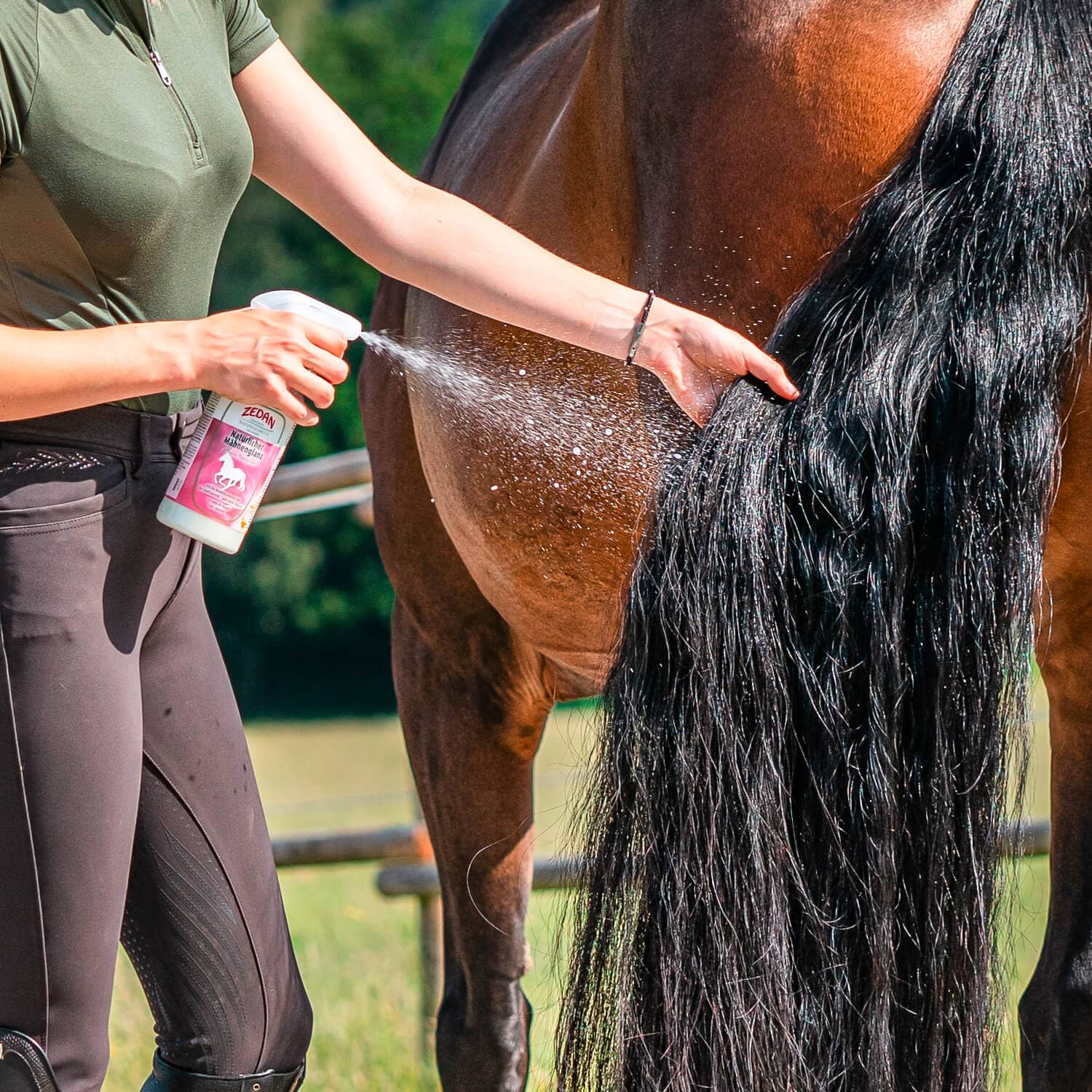 Εφαρμογή: Ανακινείστε δυνατά πριν τη χρήση, εφαρμόζουμε σε καθαρή χαίτη και ουρά με ομοιόμορφους ψεκασμούς και αμέσως χτενίζουμε με βούρτσα.