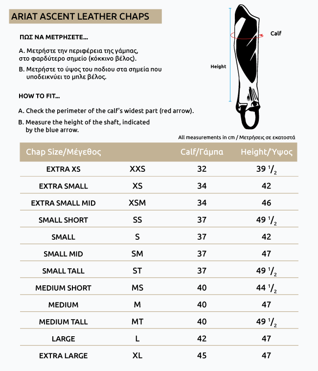 | Μέγεθος Γάμπας | EXTRA SMALL, XS MID, SMALL SHORT, SMALL, SMALL MID, SMALL TALL, MEDIUM SHORT, MEDIUM, MEDIUM TALL, LARGE SHORT, LARGE |