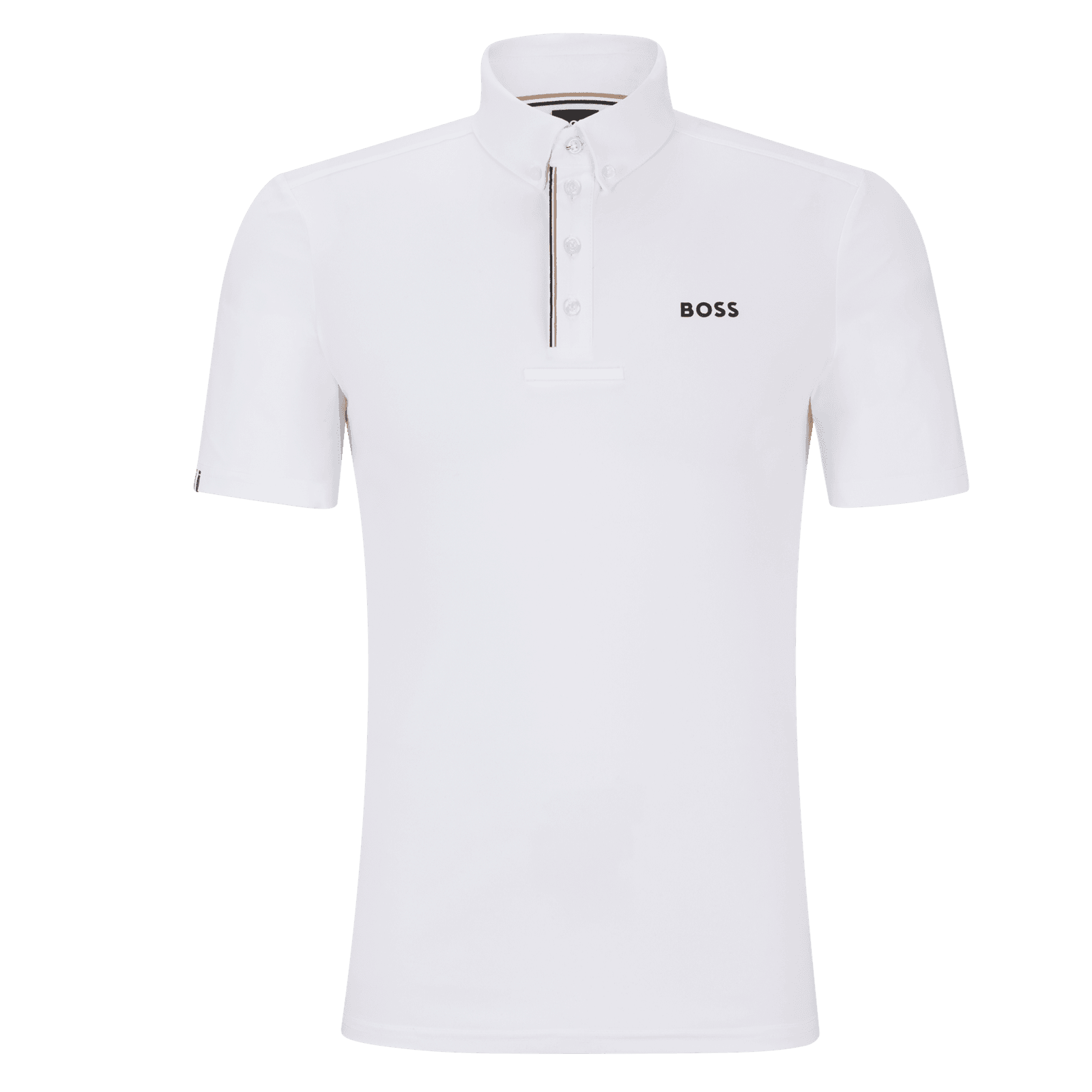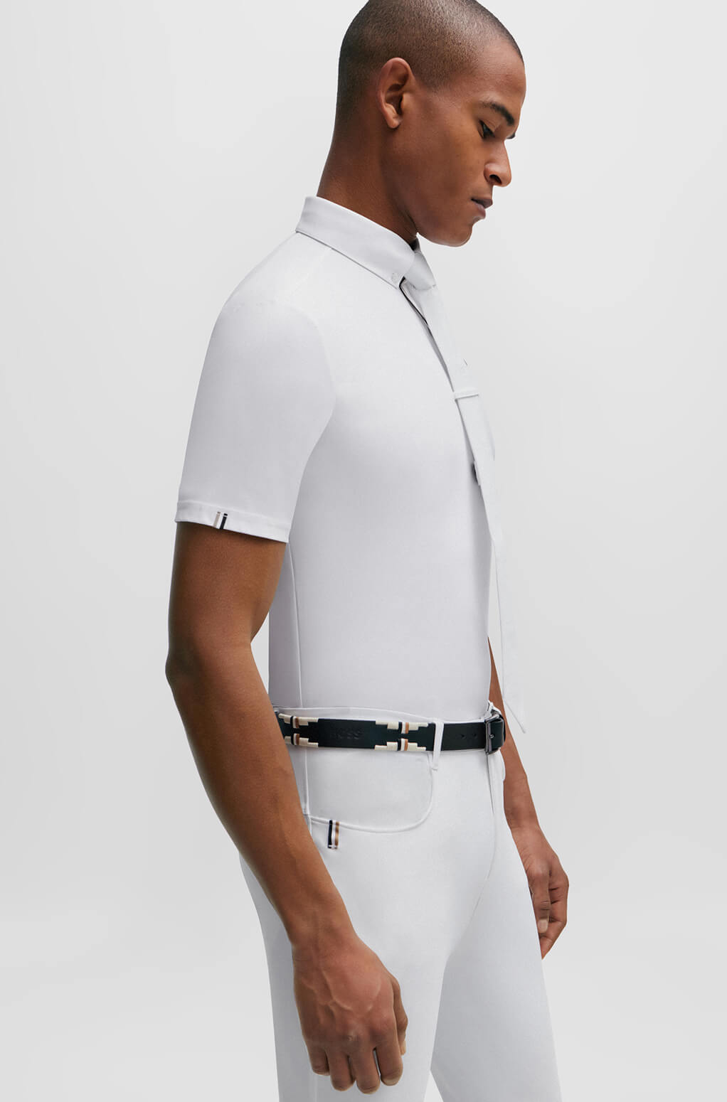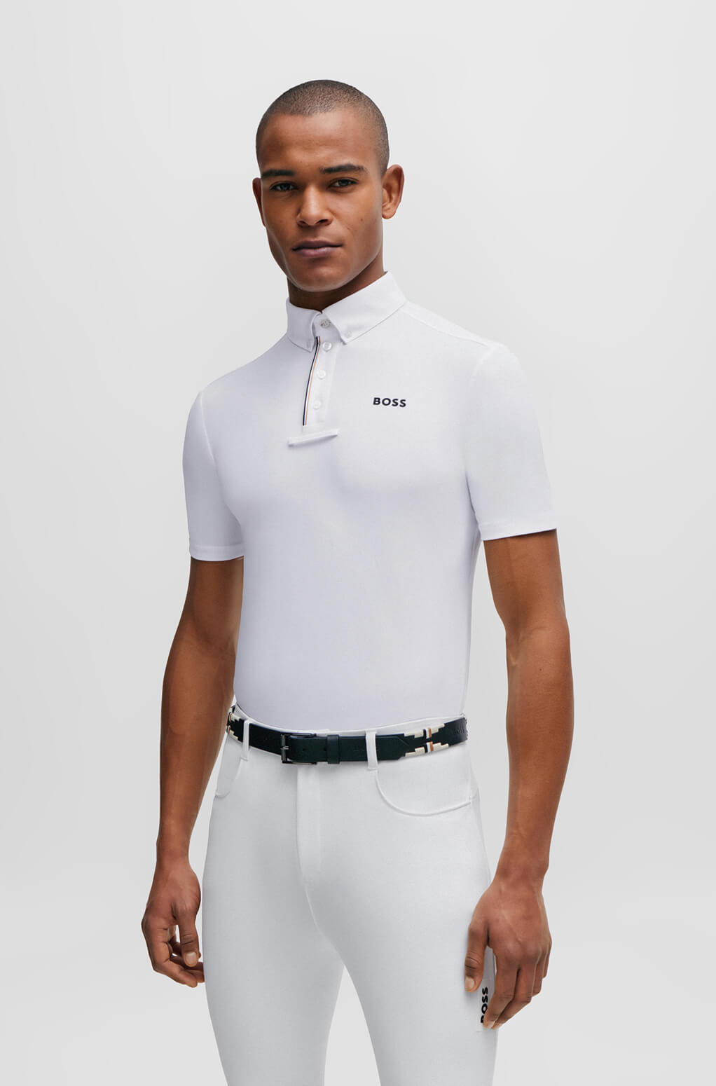 Τεχνικό show shirt με την υπογραφή BOSS EQUESTRIAN. Luxury απαλό jersey για άνεση και slim fit εφαρμογή. Υψηλής ελαστικότητας υλικό με quick dry σύνθεση. Κλασικός γιακάς με κουμπιά και θηλιά γραβάτας. Λογότυπο BOSS στο στήθος. Σύνθεση: 73% Polyamide, 27% Elastane.