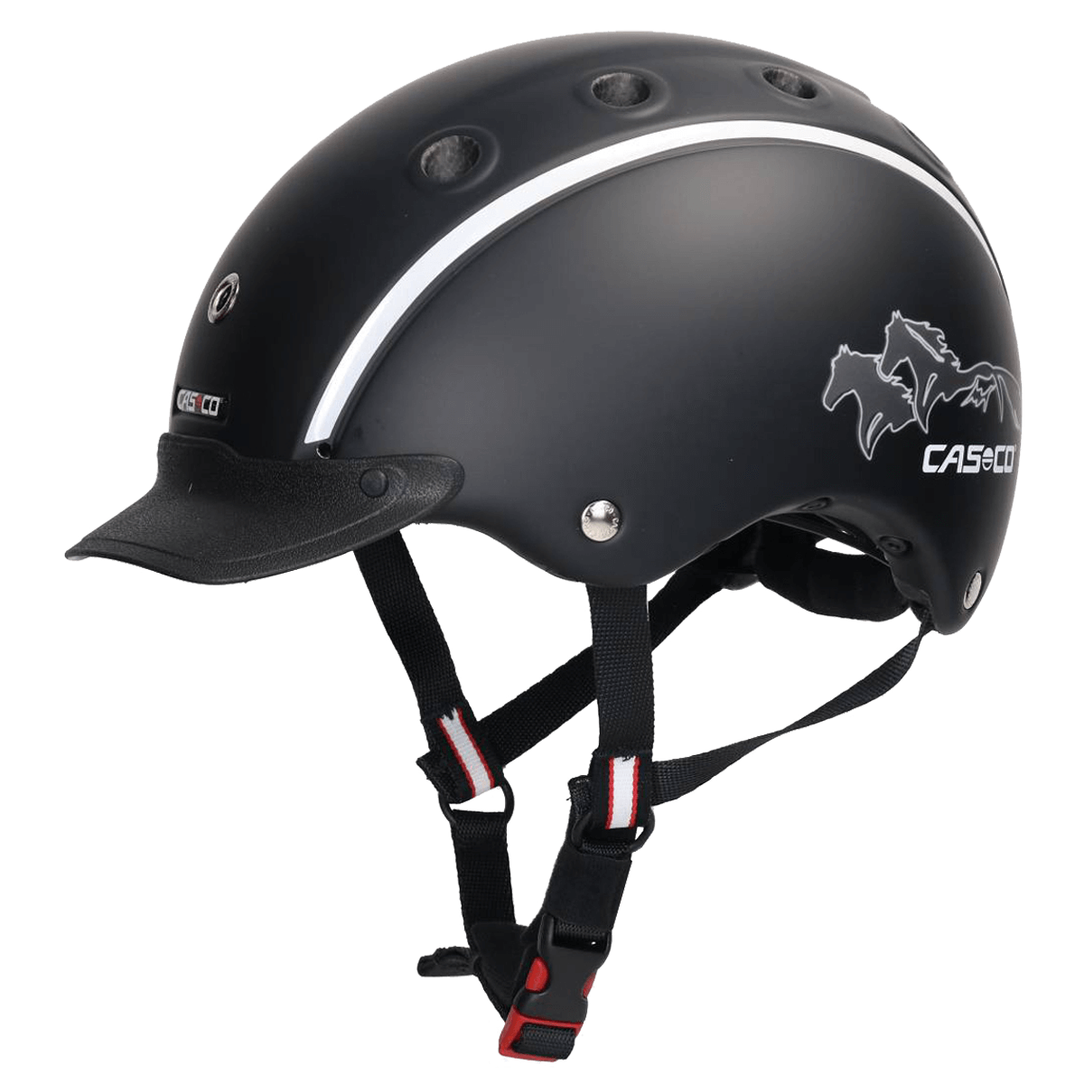 Εξαιρετικά μικρό βάρος. Πολλαπλοί αεραγωγοί προσφέρουν άνεση, χωρίς αύξηση της εσωτερικής θερμοκρασίας. Ειδικός σχεδιασμός για το παιδικό κεφάλι. Βαλβίδα και στεφάνι πολλαπλής αυξομείωσης μεγέθους. Πιστοποίηση VG1 01.040 2014-12 & EN1078 (ιππασία, ski, ποδηλασία). Αυξομείωση σιαγόνας. Πλαϊνοί ανακλαστήρες. Εκτύπωση με διάκοσμο horse head/Λογότυπο CASCO.