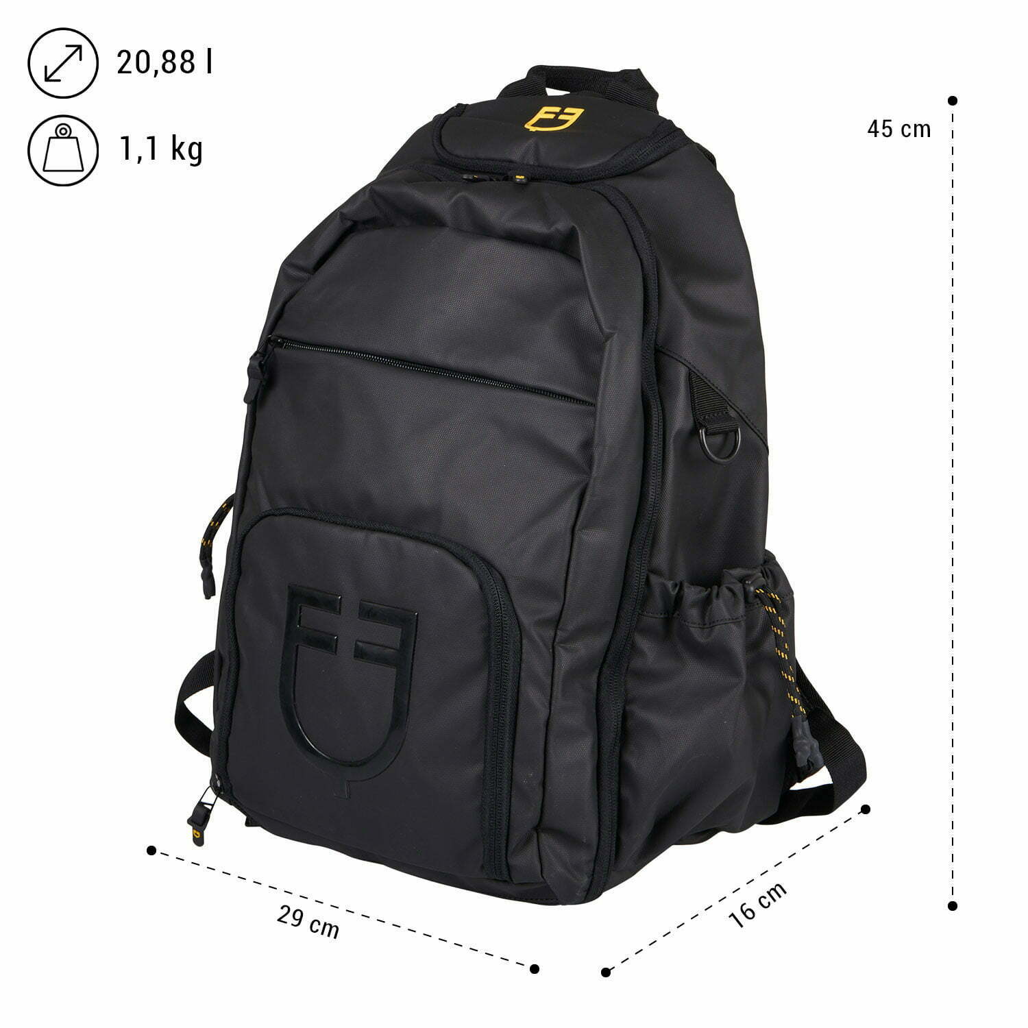 All in One σε ένα μοναδικό backpack, ειδικά σχεδιασμένο για όλη την ημέρα. Ειδικά τμήματα για ρουχισμό, εξοπλισμό, κράνος, καθώς και προστατευόμενες θέσεις για pad και φορητό υπολογιστή. Ειδική ανατομική πλάτη από διαπνέον mesh, προστατεύει από υγρασία και ερεθισμούς. Πολυάριθμες μικρές τσέπες για αποθήκευση αξεσουάρ και μικρών αντικειμένων. Αδιάβροχο ανθεκτικό υλικό. Κεντρικό λογότυπο EQUESTRO.