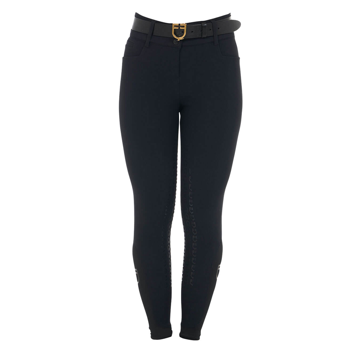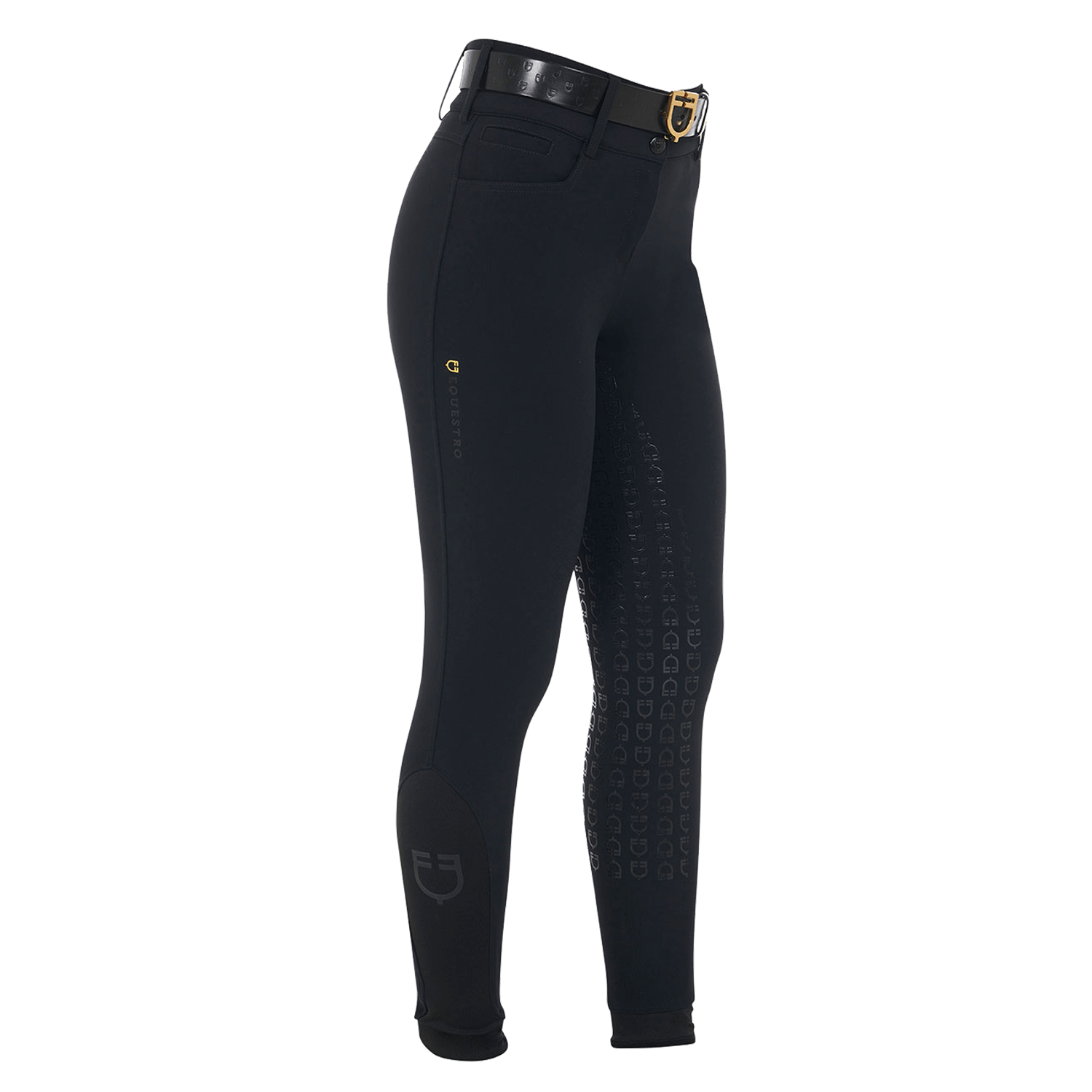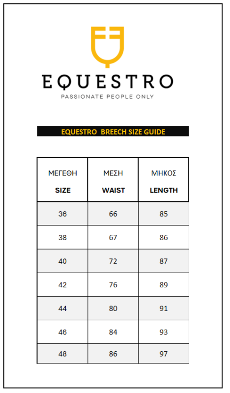 Παντελόνι ιππασίας σε κλασική equestrian slim fit γραμμή, από υψηλής ποιότητας υλικά με την υπογραφή της ιταλικής EQUESTRO. Απαλή αίσθηση, άνεση και μέγιστη ελευθερία κινήσεων χάρη στο βιοελαστικό τεχνικό ύφασμα. Ειδική dry fit σύνθεση υφάσματος, προσφέρει εξαιρετική διαπνοή, διατηρώντας σταθερό το επίπεδο της θερμοκρασίας. Full Grip επικάλυψη σιλικόνης, για σταθερό κάθισμα και μέγιστη ισορροπία με τη σέλα. Χρήση τμημάτων με lycra και λογότυπο σιλικόνης στη γάμπα, προσφέρουν εξαιρετική εφαρμογή με μπότες και chaps. Φαρδιά ελαστική ζώνη για ψηλόμεση εφαρμογή με θηλιές και πλαϊνές πρακτικές τσέπες. Πλαϊνό λογότυπο με κέντημα EQUESTRO.
