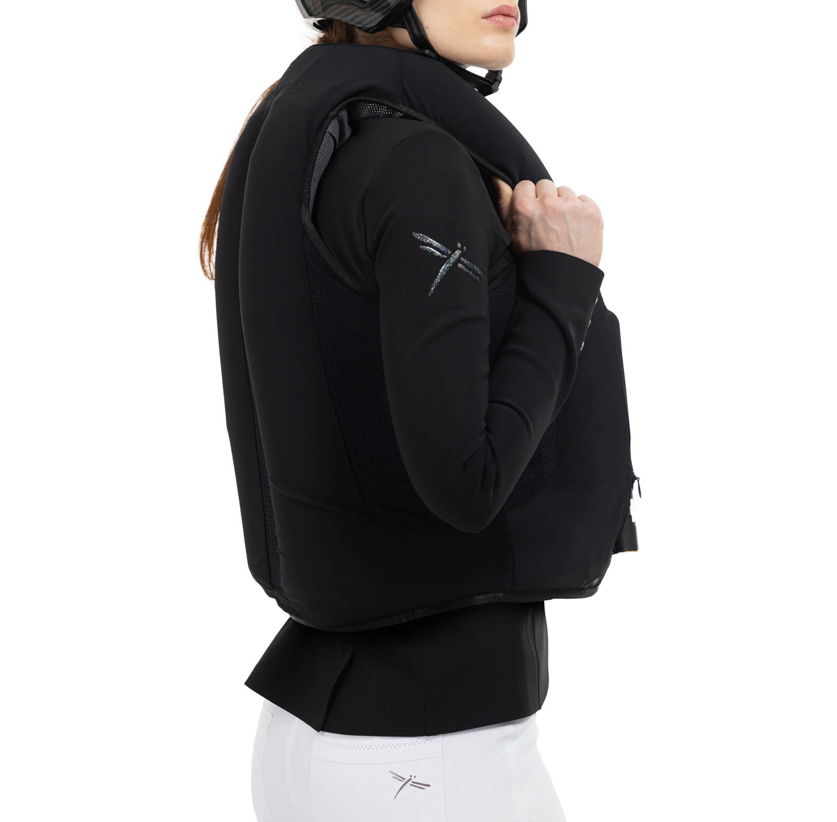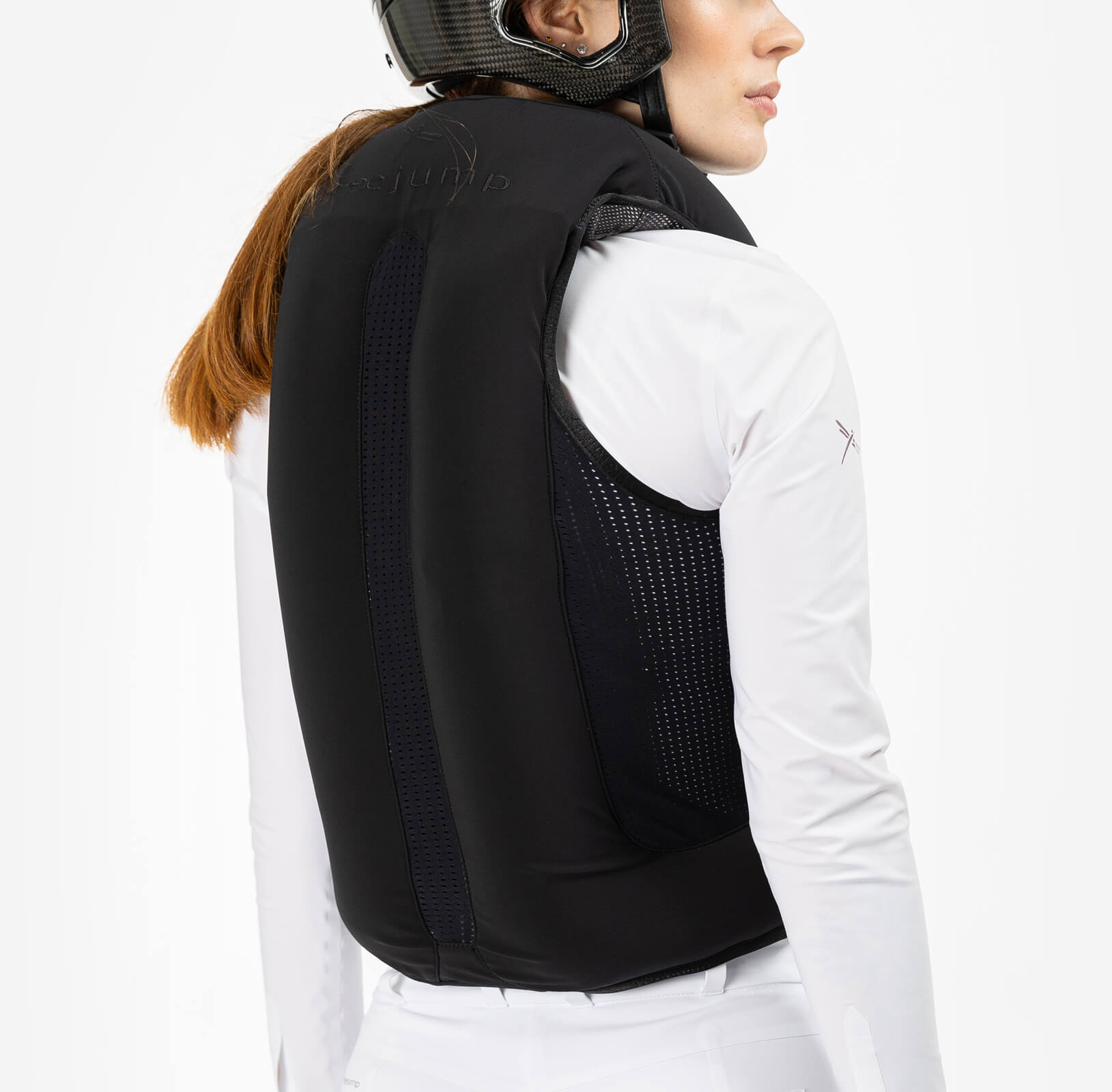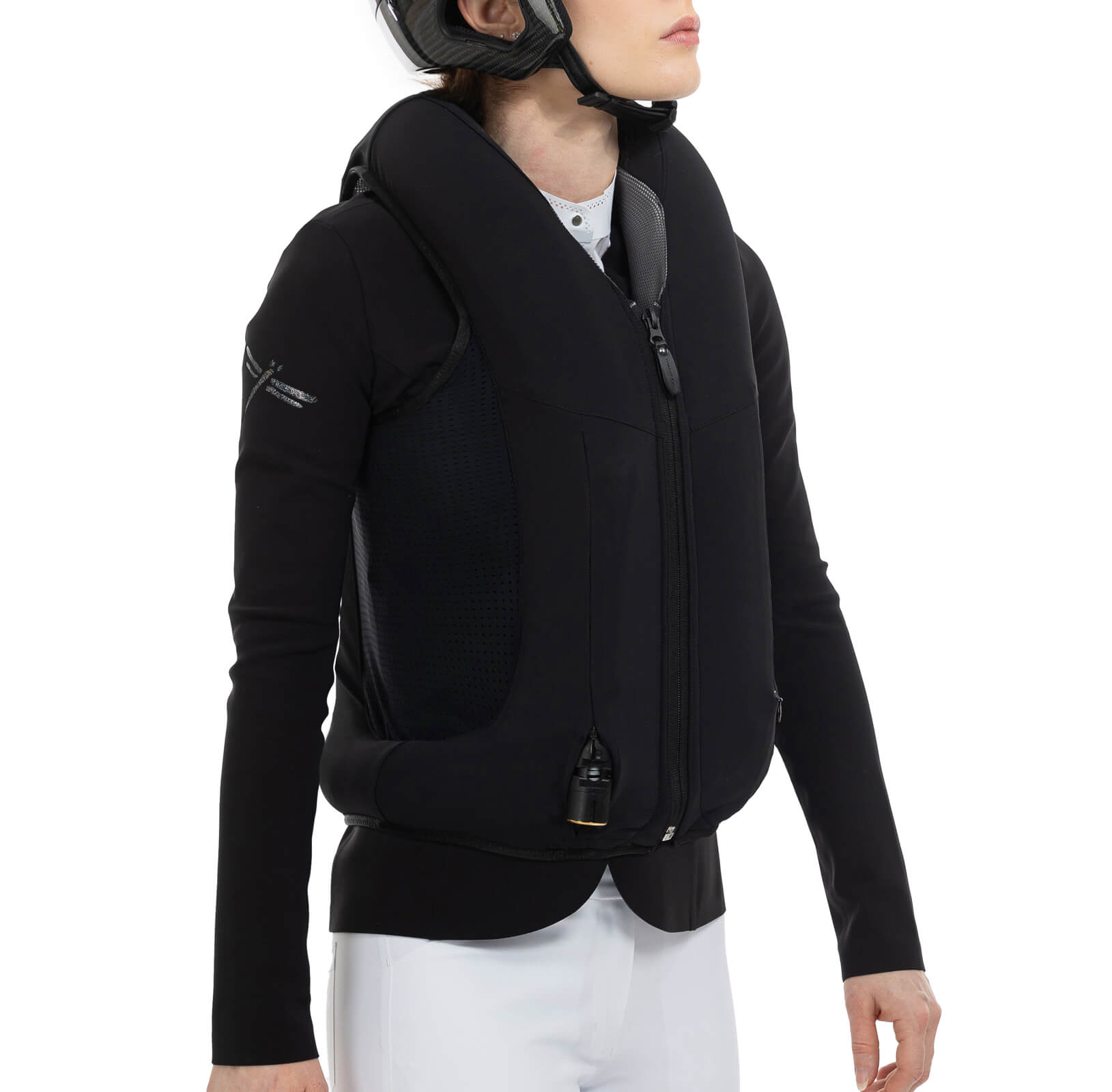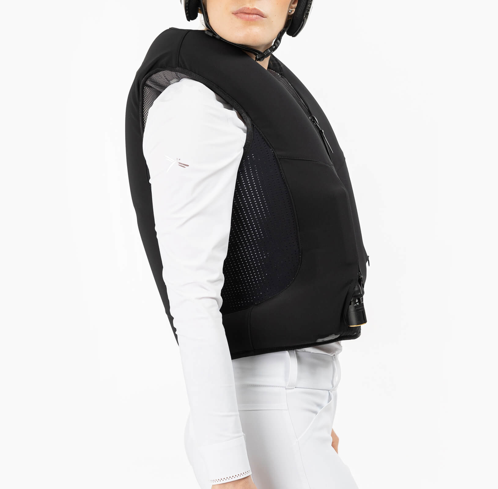 Ο πρώτος θώρακας προστασίας με αερόσακο και πρότυπα ασφαλείας NF S72-800-2022*. Καινοτόμο προϊόν εστιάζει στην επίδοση, την άνεση και την ασφάλεια του ιππέα. Πλήρης προστασία αυχένα, πλάτης, μέσης και θώρακα. Ειδικά σχεδιασμένο τμήμα του αυχένα σταθεροποιεί την σπονδυλική στήλη και τις ζωτικές περιοχές. Εύκολη προσαρμογή σε κάθε σωματότυπο, χάρη σε πολλαπλά μεγέθη και εφαρμογή slim/regular. Άμεση ανταπόκριση στη πτώση, σε ελάχιστο χρόνο (0.098sec). Εύκολη αλλαγή φυσιγγίου χάρη στο ειδικά διαμορφωμένο σύστημα. Ειδικά τμήματα κατασκευασμένα από διάτρητο ύφασμα για καλύτερο αερισμό. Μαλακά πλαϊνά πάνελ για second skin εφαρμογή. Στη συσκευασία περιλαμβάνεται φυσίγγιο CO2, ειδικός ιμάντας και σύνδεσμος για τη σέλα. Εξολοκλήρου κατασκευασμένος στην Γαλλία σύμφωνα με το εθνικό πρότυπο κατασκευής αερόσακων ιππασίας (PPE – Personal Protective Equipment). Εγγύηση 2 ετών με καταχώρηση του προϊόντος στο FreeJump System. Καθάρισμα με χρήση σφουγγαριού, με ήπια απορρυπαντικά χωρίς τρίψιμο. Να αποφεύγεται η έκθεση σε υψηλές θερμοκρασίες και σε κλειστό όχημα. Μην αποθηκεύετε το προϊόν διπλωμένο ή τυλιγμένο για μεγάλο χρονικό διάστημα. Φύλαξη σε μέρος χωρίς υγρασία. Αλλαγή φυσιγγίου αποκλειστικά με FREEJUMP cartrige 60cc. Δείτε τον τρόπο αλλαγής εδώ.