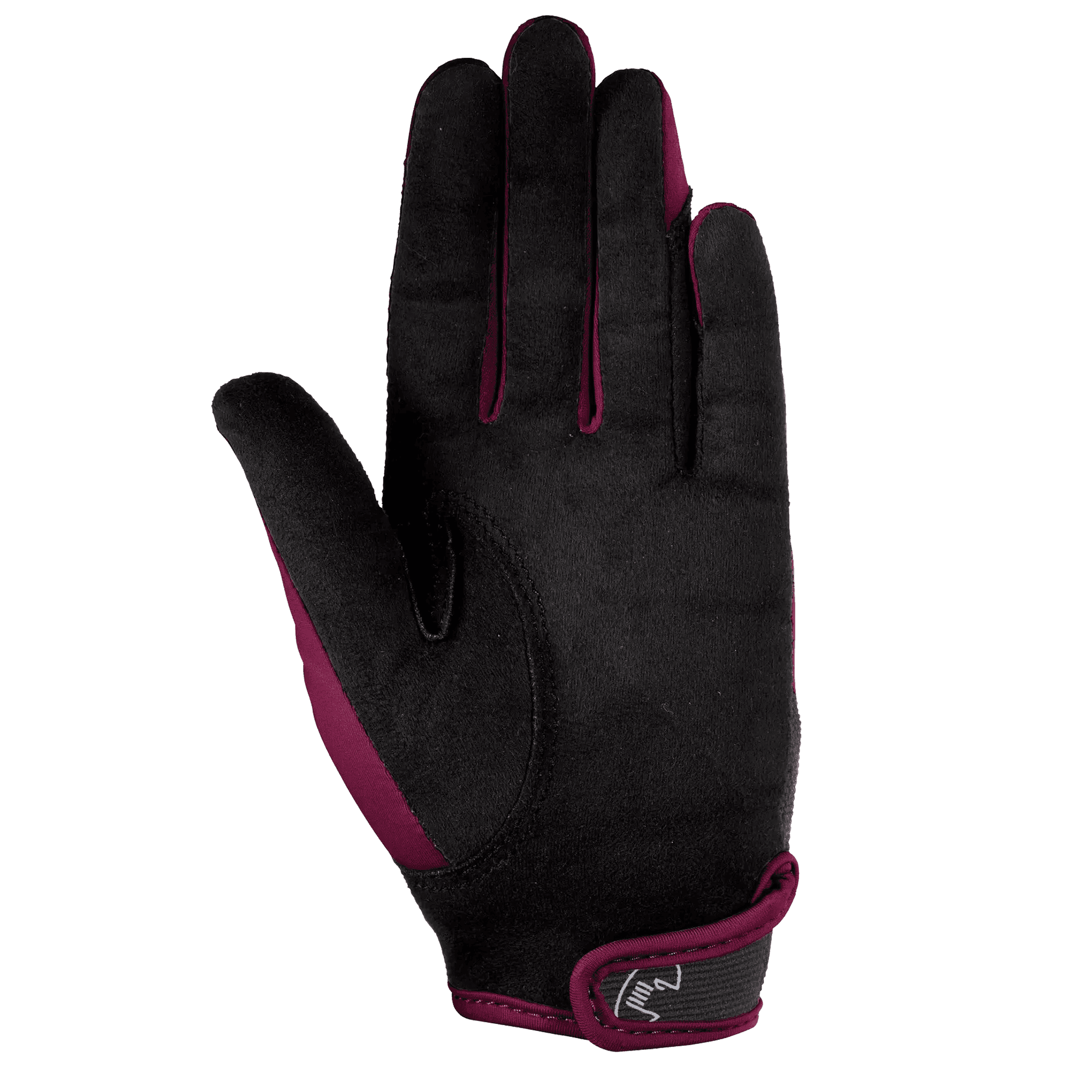 Γάντι ειδικά σχεδιασμένο για το παιδικό χέρι. Ανθεκτική ελαστική lycra στο πάνω μέρος του χεριού για άμεση εφαρμογή και ελευθερία της κίνησης. Υψηλή αντιολισθητική ικανότητα, χάρη στο συνθετικό DURASENSE Suede, στη παλάμη, προσφέρει σταθερό και ασφαλές κράτημα με τα ηνία. Glitter λογότυπο ROECKL Horsehead. Velcro αυξομείωσης και εφαρμογής στο πίσω μέρος του καρπού. Εύκολο πλύσιμο στους 30°C.